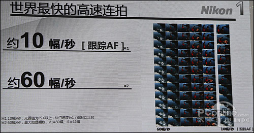 在使用跟踪AF模式下(连续自动对焦),尼康单电最高可达到10fps的连拍速度。而当锁定对焦时(以第一帧焦点为准),连拍速度更加可以一举上升到60fps。这一切都是在1010万全像素下实现的,而且降噪功能一个也不少。不过单次可连拍数量则不怎么理想,60fps速度下,V1单次可连续拍摄30张照片,J1则仅为12张,持续拍摄时间非常短。