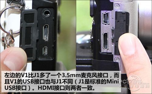 接口方面,扩展性较强的尼康V1除了比J1多了一个专用的外接扩展口,还多了一个3.5mm麦克风接口,可接原厂或副厂的立体声麦克风,增强视频拍摄时的拾音性能。
