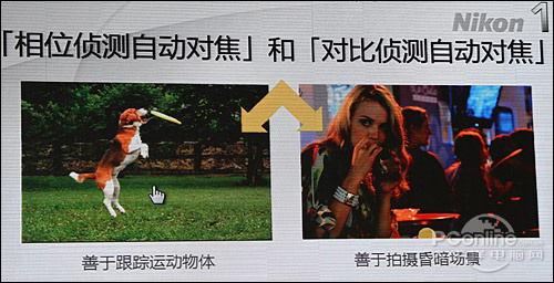 无需要额外的相位检测AF模块,尼康单电在图像传感器上直接集成了相位检测AF所用的传感器,加上图像传感器本身具备的对比侦测AF功能,尼康单电成功地把两者无缝地结合起来,并且两个对焦系统之间是自动切换的。在光线明亮的环境中会优先试用速度高、善于跟踪对焦的相位检测AF,而在光线不好的时候使用对比侦测AF。这可以大大提高自动对焦的性能。