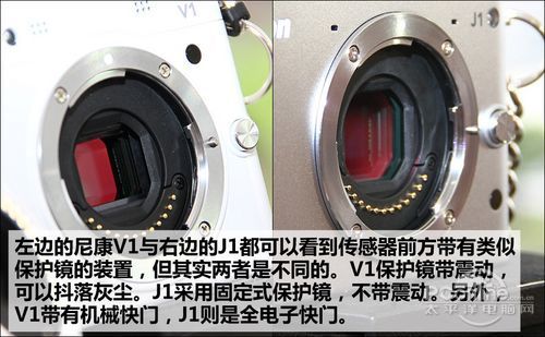 尼康V1带有机械快门,最高快门速度为1/4000秒,闪光同步速度可达1/250秒,而电子快门最高速度为1/16000秒,闪光同步速度最高为1/60秒。除此之外,V1在传感器前面还设置了一块带震动的保护镜。相信是出于成本、机身体积以及定位的考虑,J1并没有配备机械快门以及带震动的保护镜,只有一块固定的保护镜。