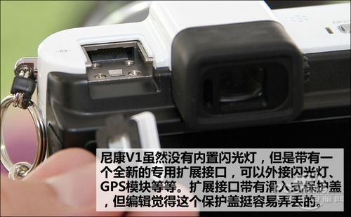 尼康V1虽然没有内置闪光灯,但带有一个多功能扩展接口,可接上外接闪光灯、GPS等配件。不过可惜的是,尼康V1依然没有配备标准热靴接口。