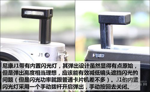 由于存在一个EVF,尼康V1并不能像J1那样设置一个弹出高度足够大的内置闪光灯,而是采用专用接口外接闪光灯的形式,给人的感觉就像当年奥林巴斯E-P2与E-PL1之间的关系。