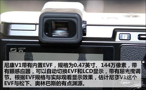 可能之前各个媒体都被索尼的236万像素OLED EVF宠坏了(事实上效果也很好),这次看到尼康V1这个144万像素的EVF不少人感觉不适应。不过以V1 EVF的规格,显示效果没有太大问题,不适应的估计只是尼康显示设定方面的不同。编辑自己就觉得V1的EVF视角稍微窄一点,放大倍率也没有索尼的大,不过显示效果足够细腻,颜色方面也一如尼康一贯的真实。