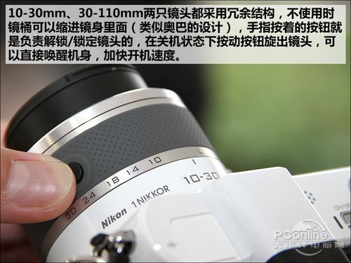 如果真的要拼体积,尼康单电的优势可能就在镜头上了。除了上面这只10-100mm电动变焦镜头体积较大外,另外三只镜头在“携带状态”下的体积都足够小,两只变焦镜头(10-30mm、30-110mm)也用上冗余结构,工作时需要把镜桶旋出来,携带时则把镜桶收进镜身内,在单电镜头领域内其体积已经算得上数一数二的小。