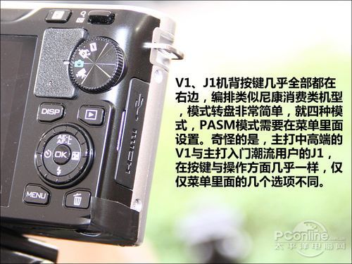 尼康V1、J1按键采用偏向消费类机型的设计,操作上也比较类似,甚至操控性还不及自家的P7100。这样的情况套用在J1这款主打时尚用户的机型上不无道理,但是在定位中高端的V1身上也是这样的偏向“傻瓜化”的操作,似乎就显得不太合适了。其实在按键与操作方面,V1与J1可以有更加大的差别。