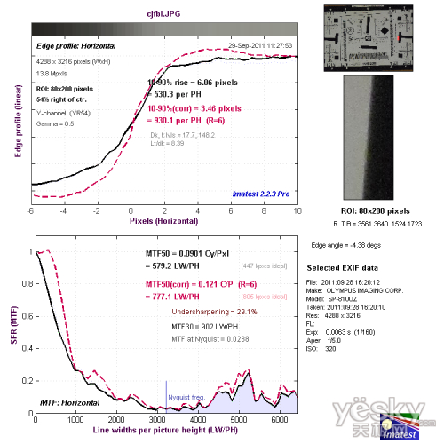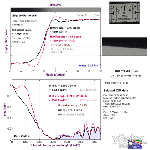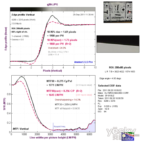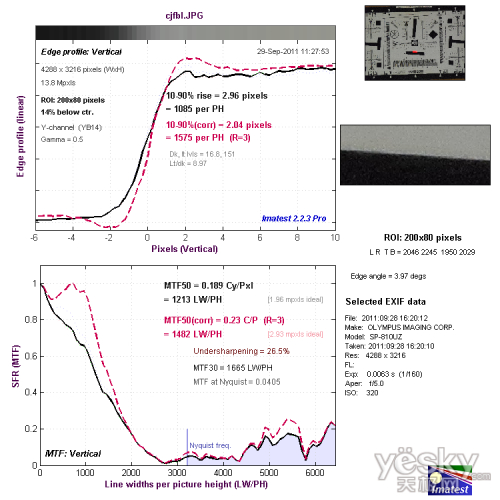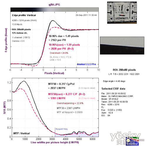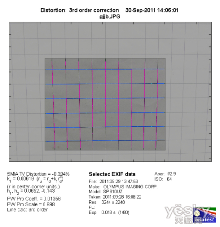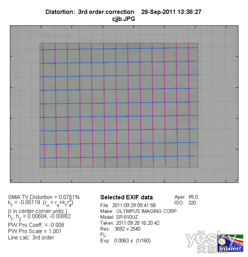 我们使用Imatest对奥林巴斯SP-810UZ的镜头分辨率与色散情况进行了测试,大家可以将测试所得的分辨率结果与上图标准进行比对,从而获得直观而明确的参考。