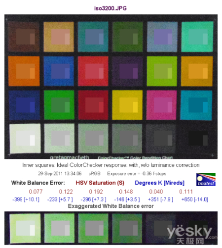 白平衡偏移方面,曝光值误差在-0.36,白平衡基本没有偏移。白平衡方面,色温 5500K的光照环境下,ISO 3200时的偏移最高处为0.192,色温偏移数值为-296,白平衡偏冷。