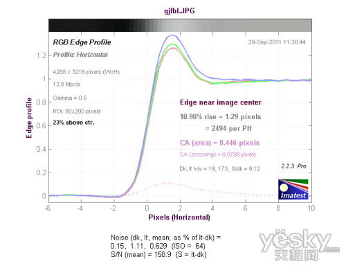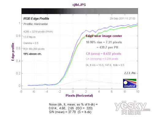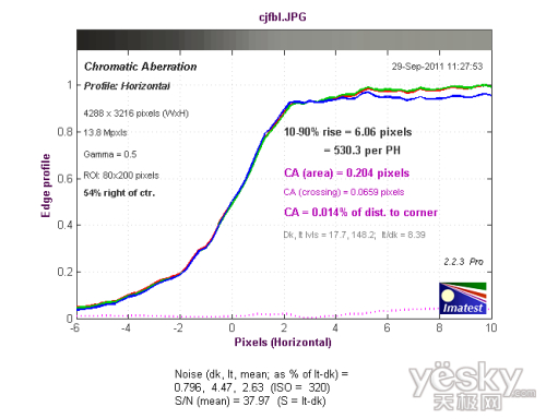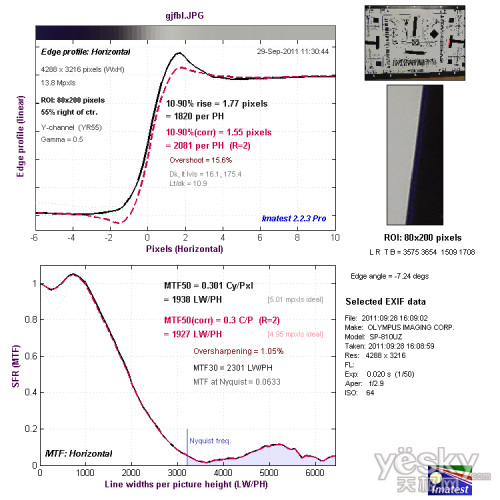 从边缘水平分辨率测试的结果看,分辨率达到了1927LW/PH,达到较好的水平,机内进行了一定的锐化,出现了驼峰现象。