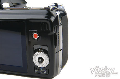 在屏幕的旁边,就是奥林巴斯SP-810UZ的主要功能按钮区域。设计比较简单,大致有菜单、?、INFO、照片回放、删除键、确定键以及摄像键,与大多数长焦相机乃至单反相机按钮布局类似,显得中规中矩,操作起来也比较便捷。