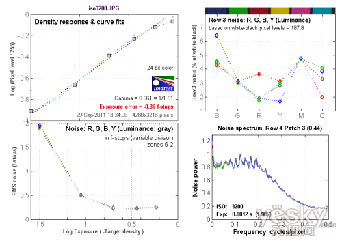 ISO 3200的最高躁点值为2左右,早点略微偏高。从Row 3 noise:R,G,B,Y(Luminance)图表中可以看到,在蓝色上是以绿色通道的噪点为最多,达到6.5左右。红色上是以红色通道的噪点为最多,达到3.9左右。绿色通道的噪点最高值出现在红色上,达到3.2左右。