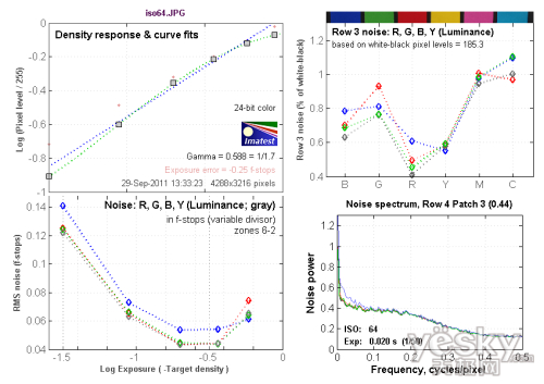 ISO 64的最高躁点值为0.141左右,属正常情况。从Row 3 noise:R,G,B,Y (Luminance)图表中可以看到,在蓝色上是以蓝色通道的噪点为最多,达到0.8左右。 红色上是以蓝色通道的噪点为最多,达到0.6左右。绿色通道的噪点最高值出现在红色 上,达到0.98左右。