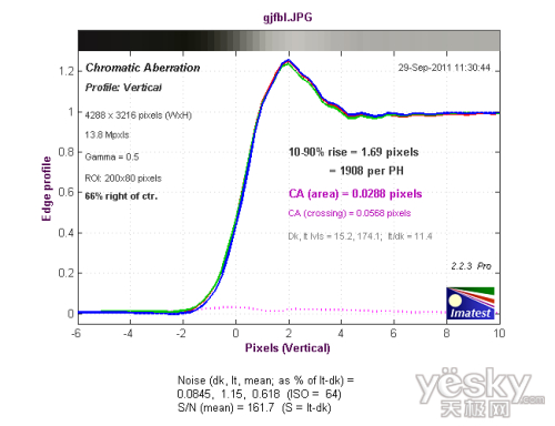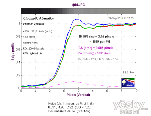从广角端中心垂直方向色散测试结果来看,色散区域为0.682像素,蓝色通道的色散高于其他三个通道。
