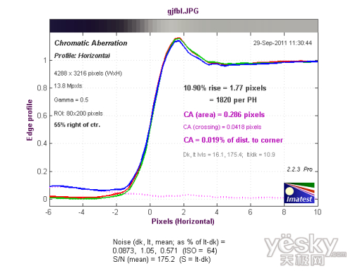 从长焦端中心水平方向色散测试结果来看,色散区域为0.632像素,蓝色通道的色散高于其他三个通道。