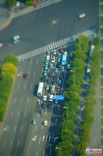 从高楼俯拍能够让原本高大的建筑与物体变得比较小,因此也就能够体现出模型般的效果,这也是微缩景观与众不同的视角之一。而在使用时可以根据拍摄的物体来选择合适的焦段与光圈,一般来说,按照被摄物体的形状来选择横向或竖向的清晰取景区域,然后再根据构图来决定这条清晰区域所靠近的位置。