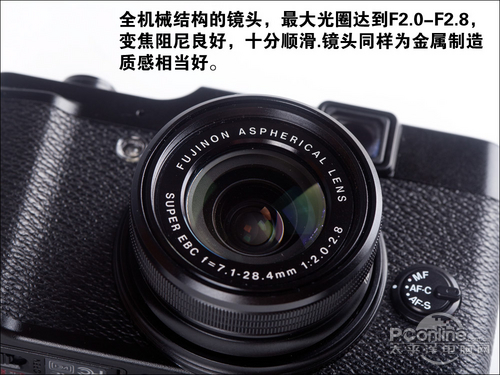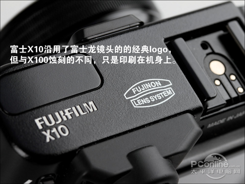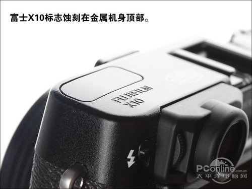 富士X10的质感,除了金属机身外,还在细节方面得到体现,X10的标识采用蚀刻方式,金属机身表面磨砂质感,富士龙镜头的经典logo也得以沿用,但与富士X100不同的是,仅仅印刷在机身上。并没有采用蚀刻的方式。
