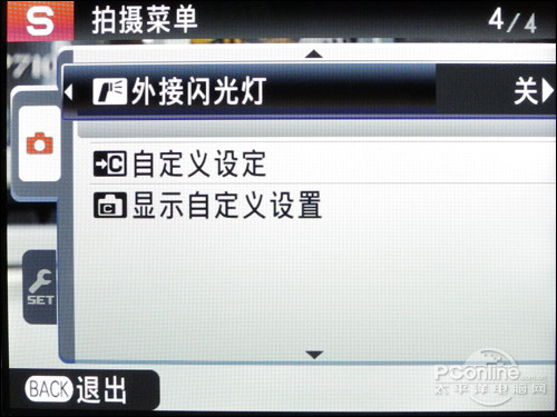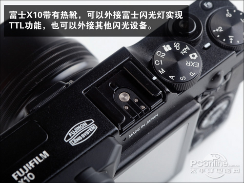 作为专业级消费相机,富士X10自然也提供了热靴接口,可以外接富士的原厂闪光灯进行TTL自动闪光,也可以外接其他闪光设备,菜单中有外置闪光灯的选项,后面的评测内容会讲到。