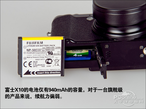 富士X10没有使用X100上的NP-95大容量锂电池,而是使用NP-50锂电池,容量为940mAh,续航力来说也可以维持200多张的拍摄,但是 对于一台专业级消费相机来说,同级对手中没有采用如此精致容量的锂电池,续航力也要靠谱得多,续航力可以说是富士X10的一大遗憾。