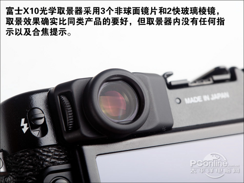 富士X10提供了光学取景器,富士对于这个光学取景器下了一番功夫,很用心,实际效果来看也确实比其他同级产品的取景器观景效果更爽快,但是取景器内除 了能看到收入画面的一部分镜头外,真的什么都没有,取景框内没有合焦提示,也没有蚀刻的指示框,取景器旁边也没有合焦提示灯。取景范围约85%左右。实际 上这种级别的相机使用光学取景器来拍摄的机会并不多,而且实用性也确实不高,多少有些浪费了富士的一番好意。