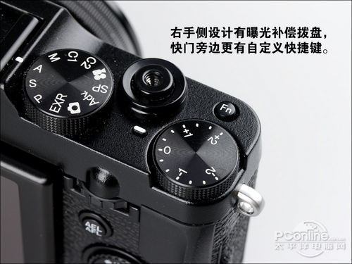 机身右手侧设计了曝光补偿转盘,通过物理方式来实现曝光补偿的调整,“该转盘隐藏金属球,可以产生出色的扭矩反馈”富士X10的介绍中是这么写的,不过 实际使用起来没有特别的感受,与平常使用的转盘阻尼类似。快门键右边的自定义功能键可以预设多种参数,使用上会更便捷。