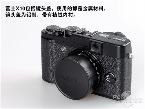 富士X10的高贵气质还从镜头盖得以体现,铝质的镜头盖手感冰冰凉,内衬植绒处理,盖上镜头盖阻尼适中,不会轻易发生掉镜头盖这种事情,还能防止金属刮碰。但取下镜头盖后则与相机完全分离,会不会不见镜头盖就难说了,作为标配配件,若是另外买肯定是很贵的。