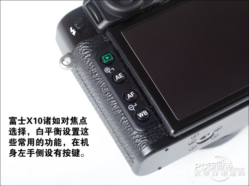 富士X10的按键布局和X100很相像,但相比较而言,富士X10的按键设定更好用一些,除了新增的三维转盘外,还在左手侧增加了WB按键,可以快速进入白平衡的设置,AF按键为对焦点选择快捷键,在拍摄状态按下可以选择对焦点,同时也充当回放时的放大缩小图片功能。