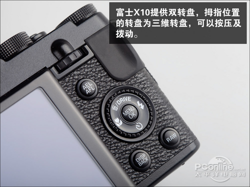 富士X10采用了双转盘设计,拇指位置的转盘既可以拨动也可以按压,与松下单电相机上的转盘类似,通过一个转盘就可以方便设置光圈及快门参数。而五维键的转盘则与X100上的类似,连操作感受都十分相像。