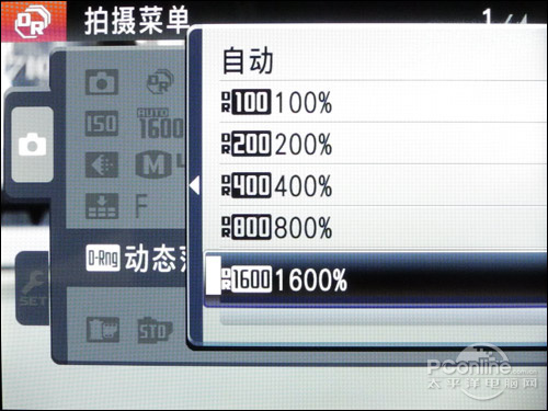 富士X10在EXR模式下的高动态优先模式,可以选择100%-1600%动态范围的设置。