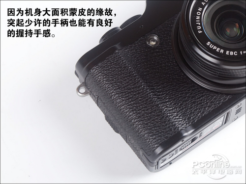 复古的旁轴相机造型。表面大面积蒙皮,手柄处不算明显的突起配合蒙皮表面已经获得相当不错的握持手感。