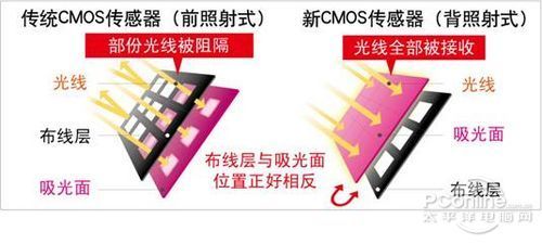 顾名思义,“背照式”CMOS可以直白地理解为光从背面照射到CMOS。传统的CMOS每个像素点都要搭配一个对应的A/D转换器以及对应的放大电路,因此,这部分电路会占用更多的像素面积,直接导致光电二极管实际感光的面积变小,感光能力变弱。而背照式 CMOS将光电二极管“放置”在了影像传感器芯片的最上层,把A/D转换器及放大电路挪到了影像传感器芯片的“背面”,而不是像传统CMOS传感器一样,A/D转换器和放大电路位于光电二极管的上层,“挡住了”一部分光线。这样一来,通过微透镜和色彩滤镜进来的光线就可以最大限度地被光电二极管利用,开口率得以大幅度提高,即便是小尺寸的影像传感器,也能获得优良的高感光度能力。同时,背照式CMOS解决了传统CMOS的线路连接层会阻塞从色彩滤镜到达光电二极管的光路,而直接导致实际能够感光更少的问题。