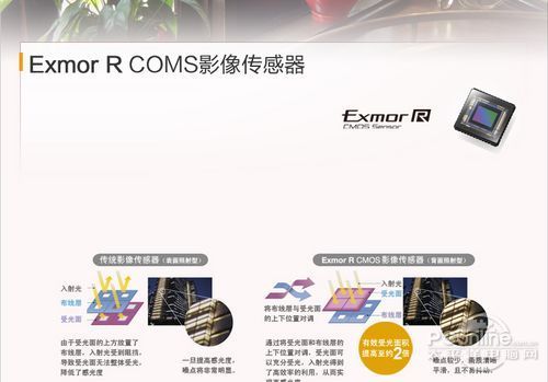 对于数码产品而言,Exmor R CMOS的出现,是将传统对于像素的追求引申到对于画质和细节的体现。革命性的物理结构,优秀的硬件指标和实拍表现,巨大的升级空间。 同样Exmor R CMOS传感器的出现是影像传感器发展史上一个新的里程碑。它的出现,彻底解决了小尺寸CMOS传感器感光能力弱的 “先天不足”,也给数码影像产业带来一次全新的巨变,对于索尼而言强大的EXMOR R CMOS处理器加上业界公认的蔡司镜头以及BIONZ处理的三剑合璧足矣巩固索尼在影像领域的地位。
