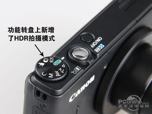 机身顶部具备模式转盘、电源开关与快门变焦杆。而模式转盘则增加了一项HDR模式,按下快门按键之后相机会连续拍摄三张不同曝光的照片再处理成一张宽容度高的相片,这是S100V一个比较突出的功能,不过小编建议使用该功能时使用三脚架以保证张个画面都稳定。