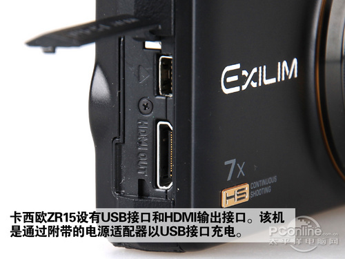 接口方面,ZR15只提供了USB和HDMI接口,只能通过USB接口连接电源适配器充电,小编觉得有点不方便。如果可以电池分开充电,这样就可以边使用备用电池,同时充电了。