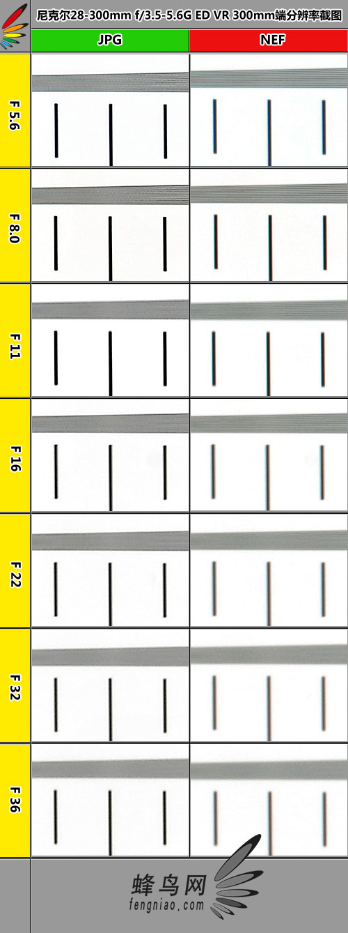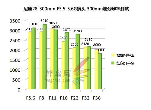 从300mm端分辨率测试柱状图上不难看出,相比广角端的测试,长焦端测试整体水平略有下降,最佳光圈出现在F8时,F5.6与F11分辨率表现亦可,而从F16以后分辨率下降趋势明显,到最小光圈F36时分辨率得分只有约2000LW/PH的水平。因此为了取得尽可能优秀的成像分辨率,建议大家使用NEF格式拍摄,并使用接近最佳光圈的光圈档进行拍摄。