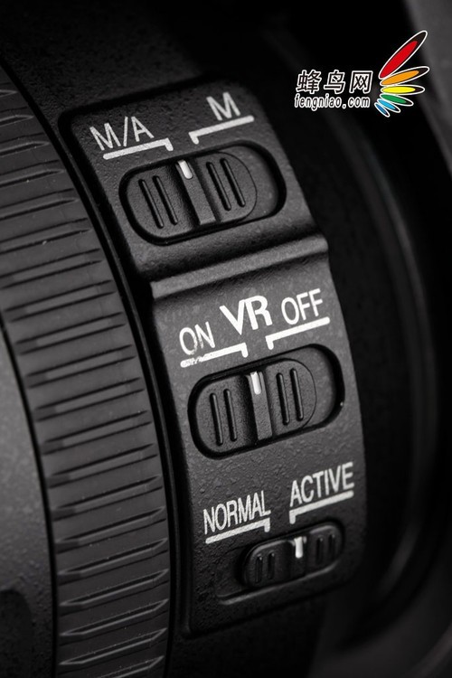 在镜头安装在机身上以后,镜头左侧有3个拨杆,自上而下是自动/手动切换拨杆、VR防抖开关和防抖模式拨杆。其中NORMAL模式是最常用的防抖模式,ACTIVE适合摇摄时使用,不修正水平方向的抖动。