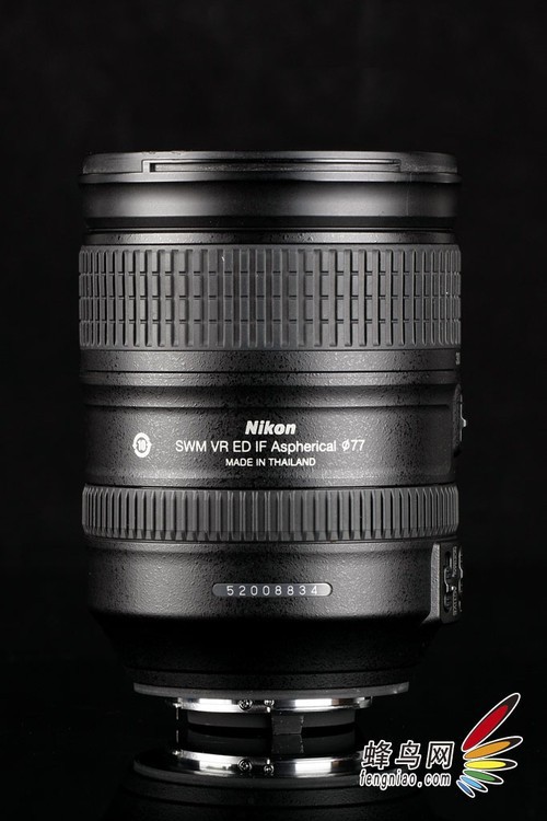 从镜身后侧的标识上,我们可以进一步了解镜头的设计细节,其中镜头使用了SWM宁静波动马达、VR光学防抖、ED超低色散镜片、IF内对焦设计和ASP非球面镜设计。镜头滤镜尺寸为77mm,产地为泰国。
