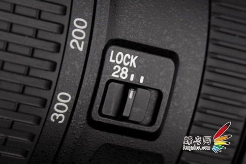 尼康28-300mm镜头变焦环约有两指的宽度,采用橡胶材质,旋转时手感适中、略紧,通常经过一段时间的使用变焦环也会变松,使用28mm端的镜头锁可以防止镜头的意外脱出。手动对焦环位于镜头焦距窗后方,与变焦环不同的是,对焦环采用塑料材质,手感不比采用橡胶材质的变焦环,手动对焦时也会略感生涩。