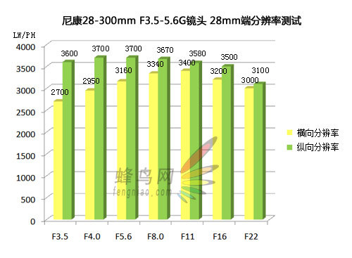 从柱状图上不难看出,镜头28mm端时的最佳光圈出现在F5.6和F8时,在D3X的2450万有效像素下,呈现出突破3500LW/PH的水平,而各档光圈的平均分辨率也在3000LW/PH以上,表现可谓上乘。