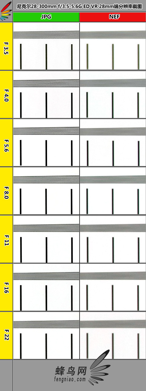在28mm广角端下,这枚镜头的光圈范围是F3.5-F22,我们在其各整档光圈下拍摄了ISO12233分辨率测试标板,并对标板靠近中央的一部分进行100%截图并排列如下,方便大家对比。同时我们还进行了NEF格式的拍摄,与JPEG格式横向进行对比。拍摄时使用标准色温恒定光源,在最低ISO下使用光圈优先模式进行拍摄。