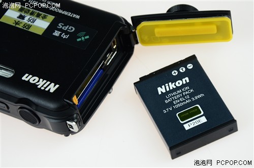 打开尼康AW100S的防水密封盖以后,电池仓、SD卡槽和数据接口就展现在我们面前了,难怪这个防水盖要做的如此严密精细,万一要是有水进入到这里面那后果可是不堪设想的。
