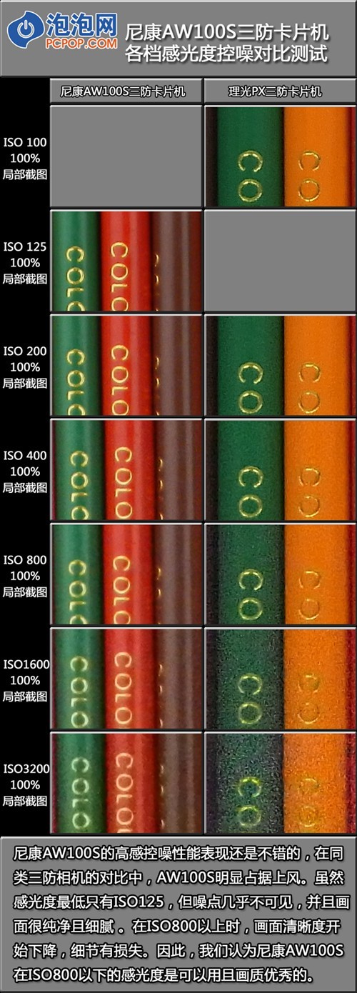 首先,三防数码相机的高感控噪性能并不是它们强项,与普通DC或高端DC产品是有差距的。但是,从尼康AW100S的对比测试中看,该机的高感控噪水平还是很高的,至少超于其它三防数码相机是没有问题的。尼康AW100S在低感ISO125时,画面细腻噪点几乎看不到,清晰度保持的也是非常不错。当提升到ISO800时,噪点并没有大量显现,但是画面清晰度明显开始下降,细节开始出现损失。至于最高ISO3200的表现,只能说是个摆设,没有实际应用价值。