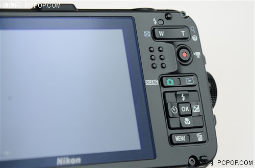 尼康AW100S在按键设计方面非常简单,这也是大多数三防相机的特点所在,其主要原因就是为了提高机身的防护性。在机身顶部分别为电源开关键和快门键。而机背右侧为主要的功能按键区域,从上到下包括了W/T变焦键、视频录制键。中部绿色键用于不同拍摄模式的选择,在下面就则是多功能方向键等,这些按键全部做了防水处理,因此在水中进行功能调整是完全没问题的。