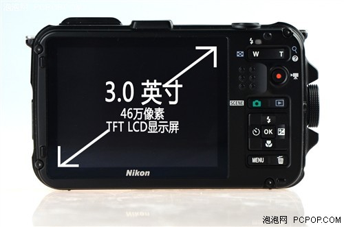 尼康AW100S采用一块3英寸46万像素TFT LCD显示屏,符合主流DC产品配置。该屏幕为了适应不同环境下拍摄,还提供了正负5级别的亮度调节,为了提高在水下拍摄取景时的清晰度,还特别增加了防反射涂层,同时屏幕外壳的硬度也是非常不错,朋友们在使用时完全不用担心像普通DC屏幕那样脆弱的划伤屏幕。