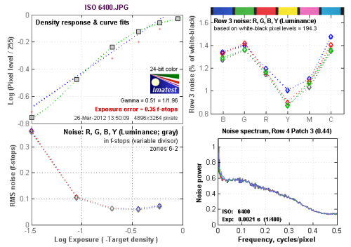 ISO 200的最高躁点值为0.25左右,情况非常好。从Row 3 noise:R,G,B,Y(Luminance)图表中可以看到,在蓝色上是以绿色通道的噪点为最多,达到0.85左右。红色上是以红色通道的噪点为最多,达到0.65左右。绿色通道的噪点最高值出现在蓝色通道上,达到0.7左右。