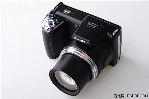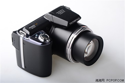 奥林巴斯SP620作为一款具有21倍光学变焦的数码相机,其机身体积明显要大于普通卡片机。而这枚大变焦镜头的体积几乎占据了大半个机身,为了增加用户在握持上的稳定性,增大宽厚的手柄设计是不能免的。