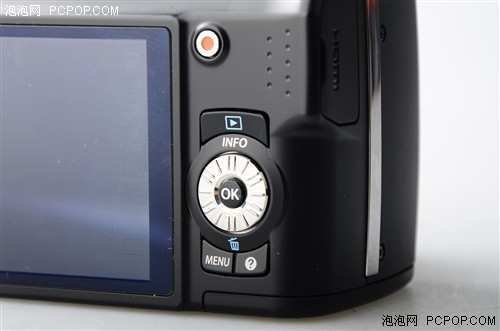 在机身背面上,主要分布了一个多功能转盘和4个功能快捷键,我们在日常拍摄中的一些主要功能只需要这几个按键就可以完成调整操作,可谓是相当的简洁。