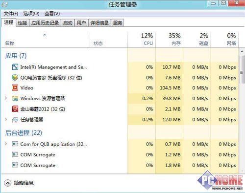 而且值得注意的是Win8 的新版任务管理器和文件复制窗口一样都拥有详细信息和简略信息两个模式可以选择,而这样人性化的设计也使得用户的使用体验得到了大幅度的提升。