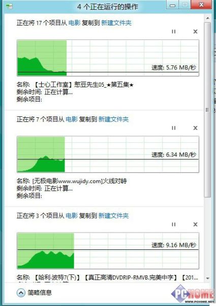 Windows 8的所有文件复制窗口都是以新界面合成为一个出现的,能够在复制文件的操作过程中显示出文件复制的进度和速度,并能够根据实时情况调整部分文件复制的优先级,以优化复制速度。