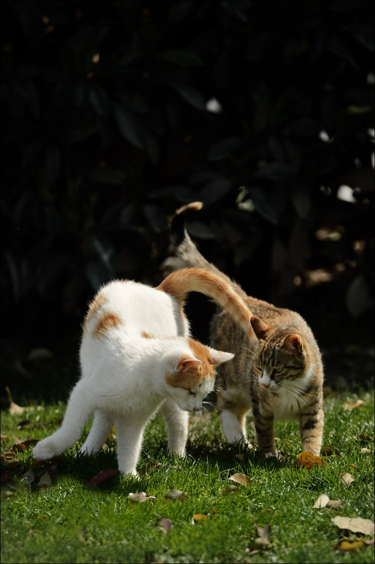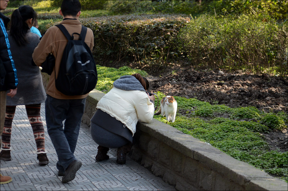 总之,公园里的猫儿们早已经被好心人们宠坏了。看到人们过来,基本都不会很快逃走,相反还有胆子大的一边喵喵叫一边跑过来亲昵的蹭你脚踝——喵呜~给点好吃的吧~我会卖萌哟~喵呜~