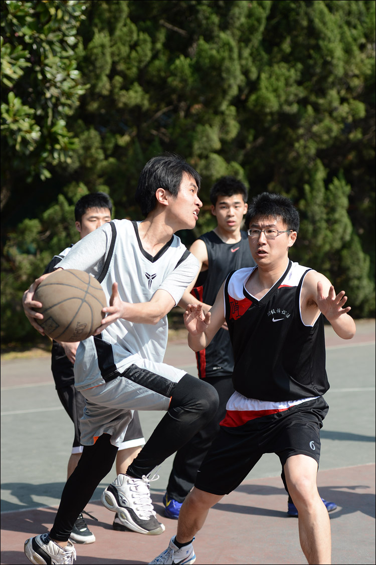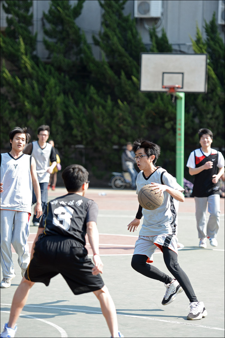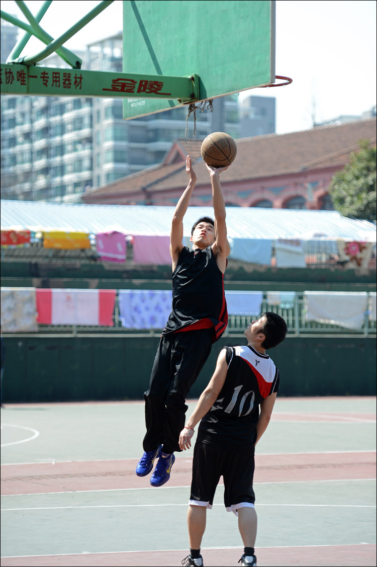 简单的介绍一下器材:尼康D4+小竹炮和24-70镜头,也就是新大三元里的后面两支;简单的介绍一下拍摄方式:连续对焦,单次对焦,中心点对焦。速度优 先模式,快门速度设定在1/1000-1600s之间,低速高速连拍都用。好吧,更直白一点说,那就是抄起相机随便按快门——用D4这种机器根本不用担心 拍不到,无论是猫还是打篮球的学生们。所谓工欲善其事必先利其器,虽然我们不应该“唯器材论”,但我必须要说,这套让我觉得沉重无比的器材(谁让我微单用 惯了)拿来干活实在是太给力太顺手了。