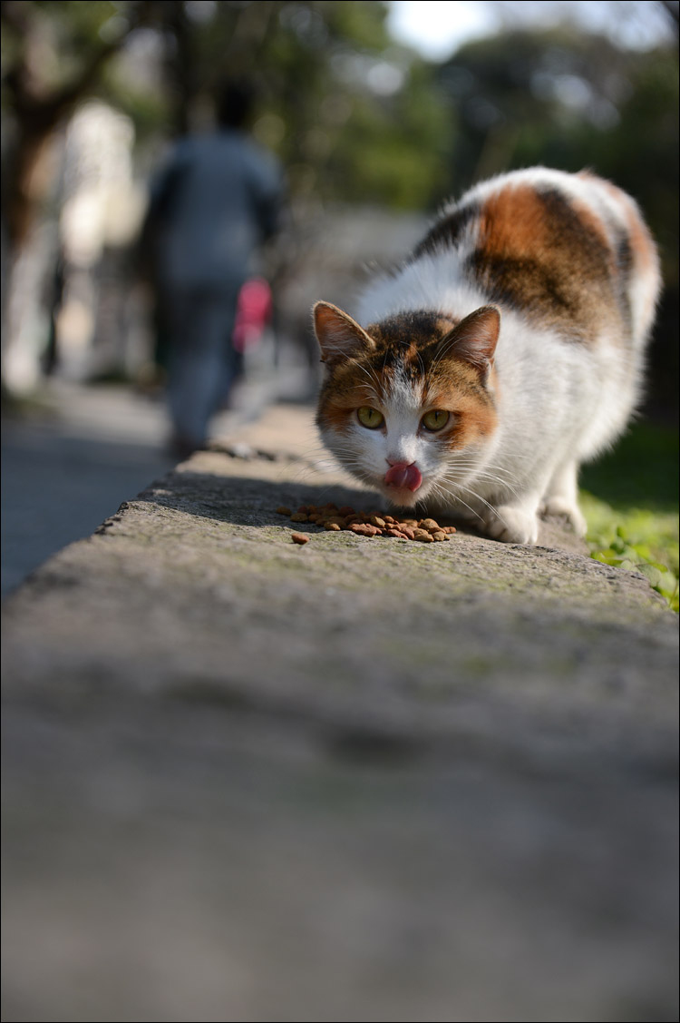 好在临走出校门时,看到一只胖乎乎的猫咪正冲着一个MM相机镜头摆Pose。这个小家伙大概平时颇受人宠爱,所以并不太怕生。我在它前面放了点猫 粮,它站在阳光里思索了一下,最后还是满满的跑过来开心的大口吃起来。真心希望,华政的猫咪们能够继续得到好心人们的照顾,让这些实际打心眼里愿意与人亲 近的小生灵能够在校园里得到更多一点庇护和温暖。